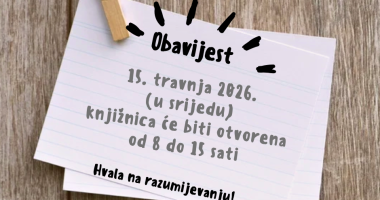 Poštovani, 15. travnja 2026. (u srijedu) knjižnica će raditi u skraćenom radnom vremenu, od 8 do 15 sati. Zahvaljujemo na razumijevanju!
