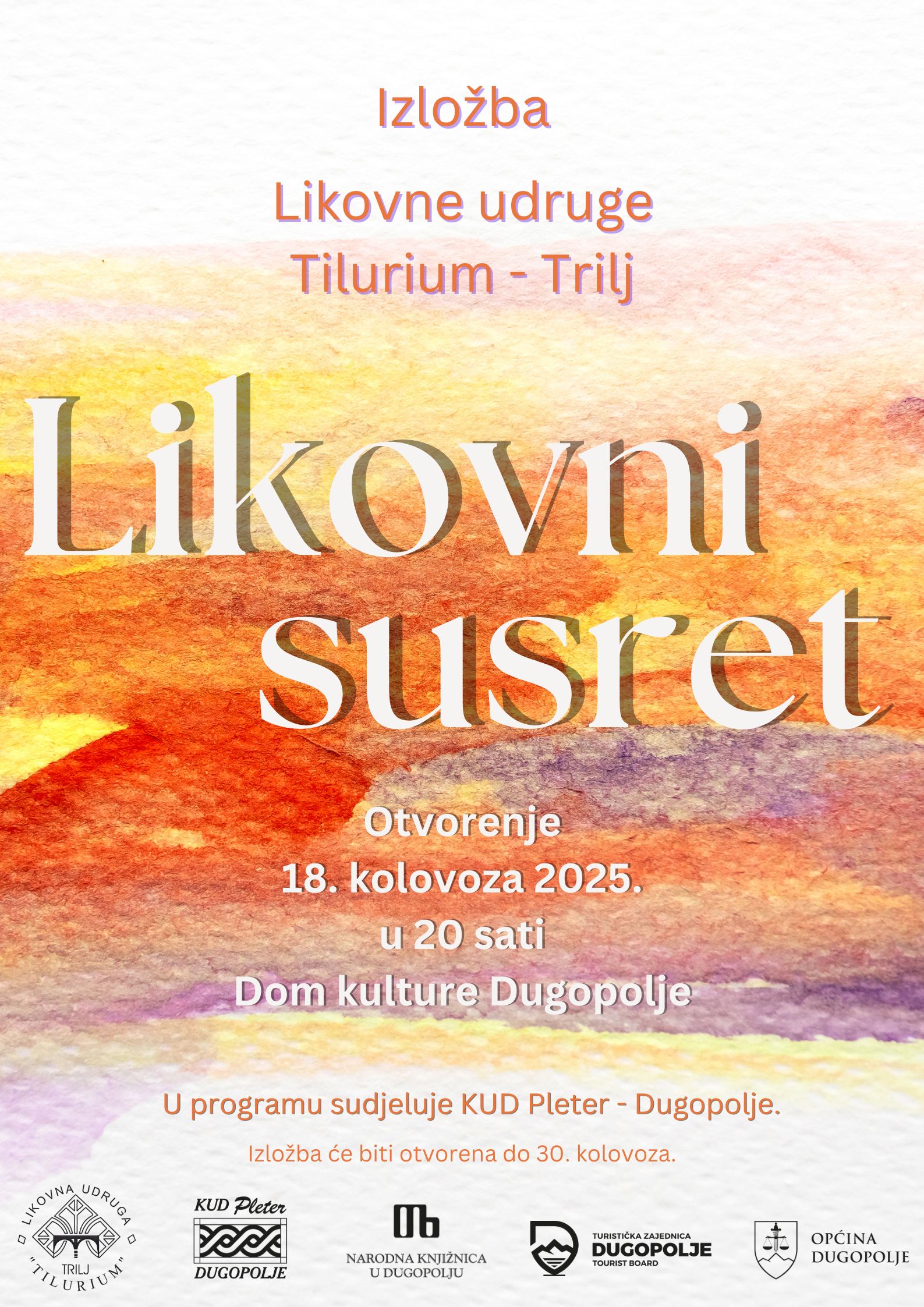 Najavljujemo još jedan kulturni događaj u sklopu Podmosorskih ljetnih večeri: otvorenje izložbe Likovne udruge Tilurium iz Trilja, u dvorani Doma kulture Dugopolje, u ponedjeljak 18. kolovoza u 20:00 sati.