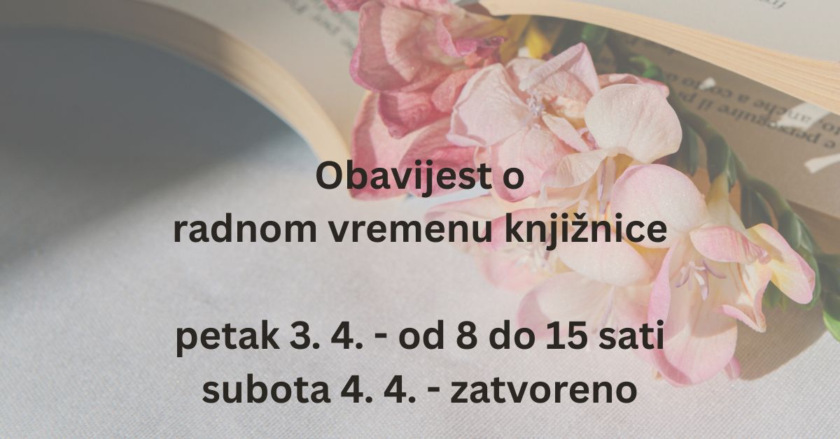 knjižnica će u petak 3. travnja raditi od 8 do 15 sati, dok će u subotu 4. travnja biti zatvorena.
